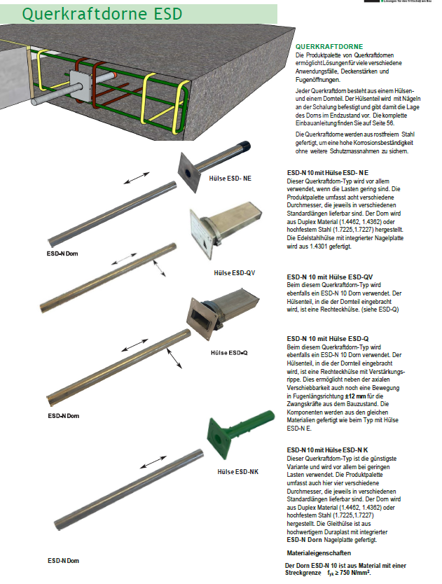 Die ESD-Querkraftdorne dienen zur kontrollierten Übertragung von Querkräften in Bewegungsfugen von Stahlbetonbauteilen.