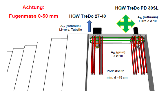 Die Treppendornsysteme HQW TreDo PD 30 SL und HQW TreDo PD 30 S sind speziell für treppenseitige Podestanschlüsse mit erhöhten Anforderungen an Tragfähigkeit und Trittschallentkopplung entwickelt.
